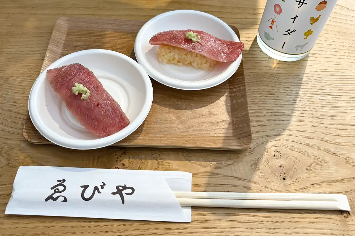 松阪牛を使った肉寿司は、口に入れた瞬間に広がる旨みと、とろけるような食感が特徴で、食べ歩きにもぴったりの一品です。
