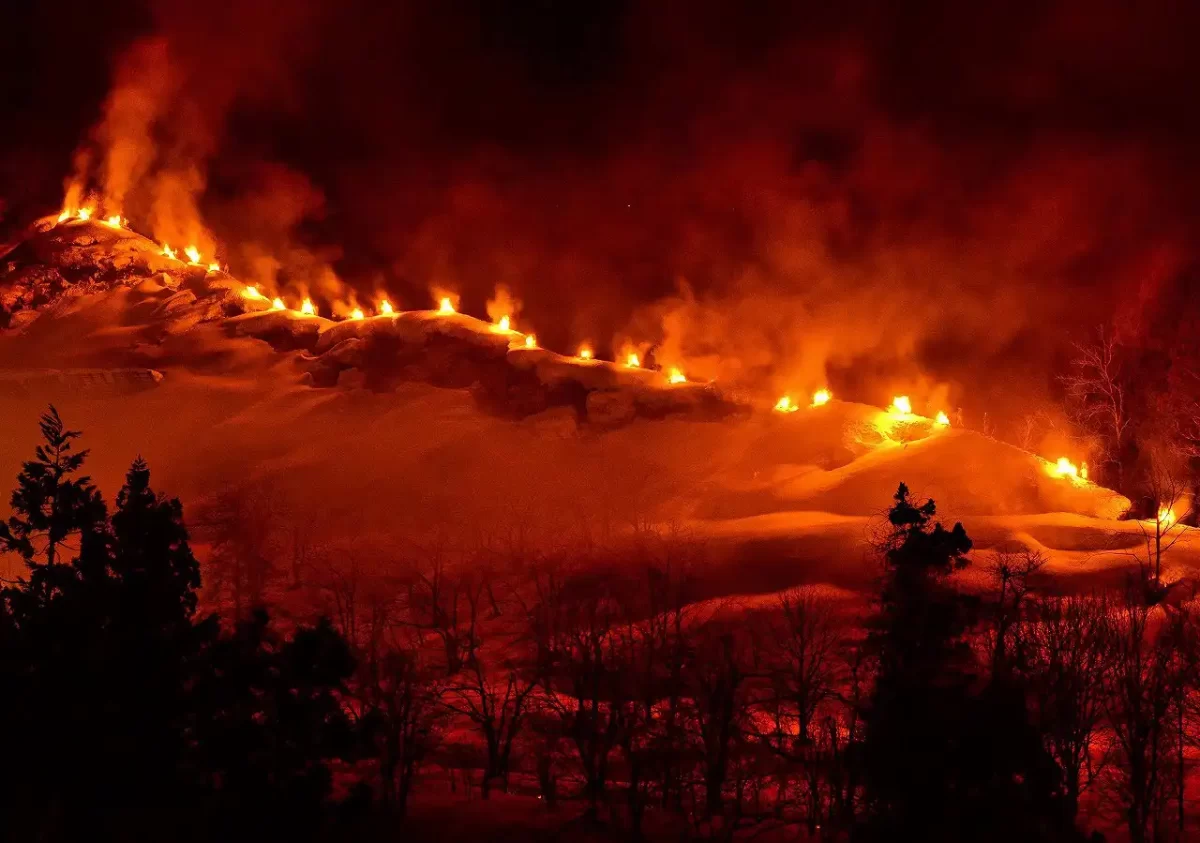 雪山の尾根に点々と浮かび上がる 108の藁火の明かり は、思わず息をのむ幻想的な光景。