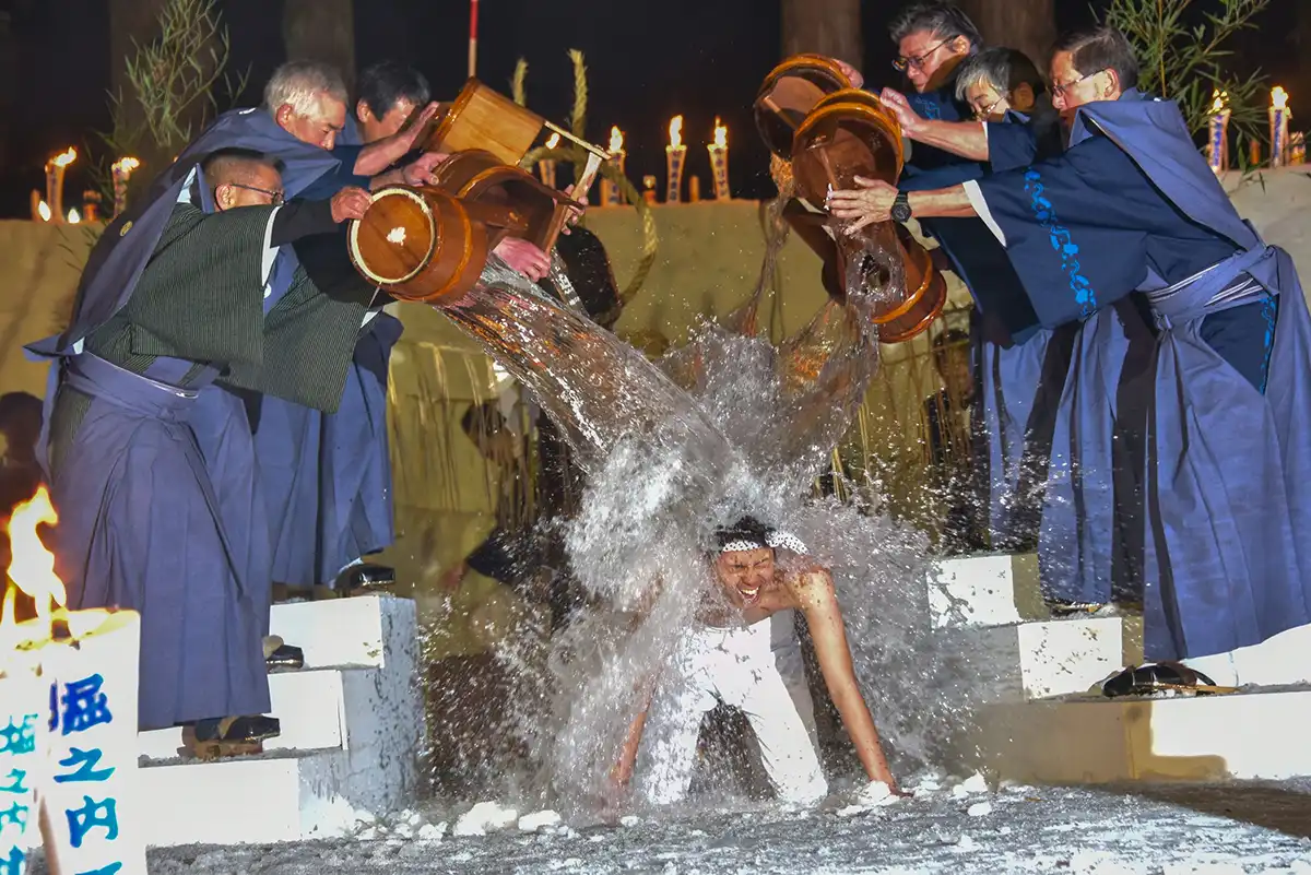 江戸時代の随筆『北越雪譜』にも記された歴史ある行事で、前年に結婚した新婿に「若水」を浴びせるという勇壮な儀式が特徴です。